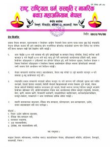 ५ फागुन,काठमाण्डाैं । भक्तपुरस्थित निजी निवासबाट प्रहरीद्वारा गएराति नियन्त्रणमा लिइएका ‘राष्ट्र, राष्ट्रियता, धर्म, संस्कृति तथा नागरिक बचाउन अभियान’का केन्द्रीय संयोजक दुर्गा प्रसाईंलाई आज साँझ ५ बजेसम्म रिहा नगरे सरकारविरुद्ध ‘वारपारको आन्दोलन’ सुरु गर्ने चेतावनी दिइएको छ।