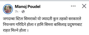 पौडेलले सार्वजनिक रूपमै “जगदम्बा स्टिल सिमराको यो ज्यादती कुन तहको सरकारले नियन्त्रण गरिदिने होला र हामी सिमराबासीलाई प्रदुषणबाट राहत मिल्ने होला” भनी गरेको मार्मिक प्रश्नले आज प्रत्येक सिमराबासीको हृदयको छटपटी र राज्यप्रतिको अविश्वासलाई प्रतिविम्बित गरेको छ।